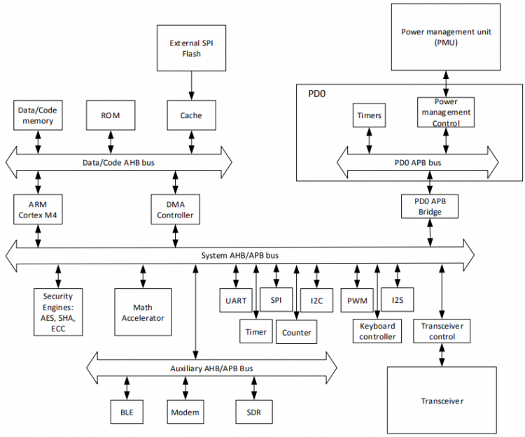 该芯片内置32bit ARM Cortex-M4F CPU 支持浮点运算,内部包含256Krom,512K Flash以及64KB SRAM,SRAM可以用作复杂算法和应用的用户数据空间。芯片内部增加数字加速引擎,加密模块,语言处理模块,数字加速引擎最多能处理16*16矩阵运算,支持矩阵加、减、乘、除等多种运算。加密模块可以为客户提供更好的加密算法,支持AES128、AES256、SHA-1,SHA-2和ECC加密功能,以及内部有唯一ID号,语言处理模块支持1:4语言压缩跟解压,支持PDM及I2S输出。