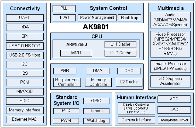 AK98系列处理器采用ARM926EJ内核,具备720P的视频解码性能,支持大尺高速UARTSDIO控制器、以太网MAC控制器、视频输出等。