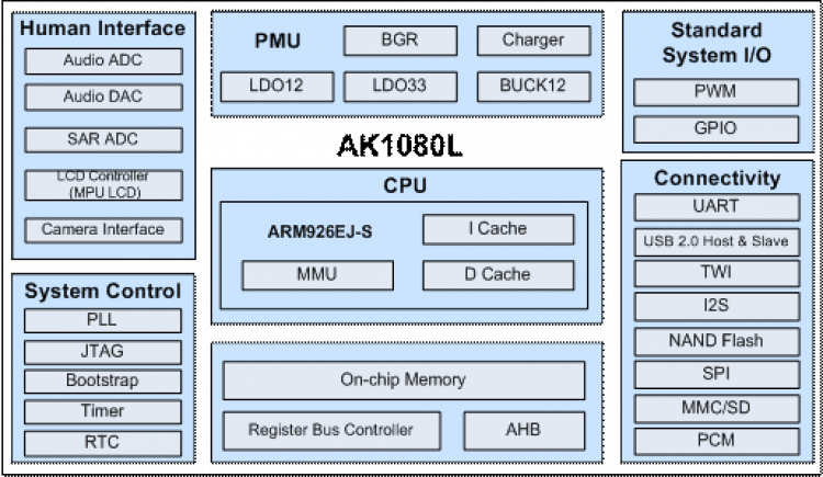 安凯AK10L系列处理器采用ARM926EJ-S内核,内置RAM,终端产品无需外挂RAM类型存储器。