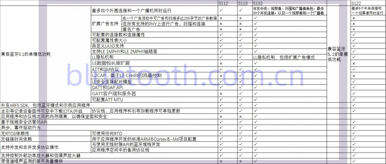 Nordic蓝牙协议栈Softdevice S112,S113,S122,S132主要特性对比