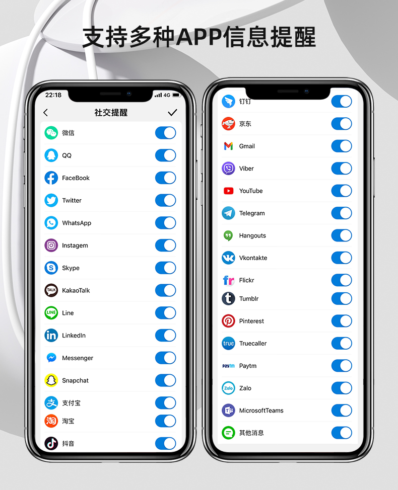 功能 APP下载,外置播卡, MP3播放音乐,消息提醒,视频控制器,18国语言,多壁纸切换使用,寻找手机/耳机,拍照控制,秒表。天气,闹钟,接打电话,震动提醒,音量调节,上下曲切换,唤醒Siri, 音乐游戏双模。