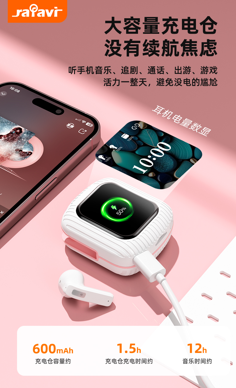 10.大容量充电仓:听手机音乐、追剧、聊天,全天活力四射,避免没电的尴尬。数字显示耳机的电量水平。600毫安时充电容量,1.5小时充电仓充电,5小时音乐播放时间;