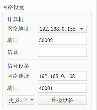 采集设备默认的IP为“192.168.0.168”,端口号为“40001”;将本机计算机IP设置与采集设备同IP段(192.168.0.X)即可,端口号“50002”,如192.16.8.0.155。
